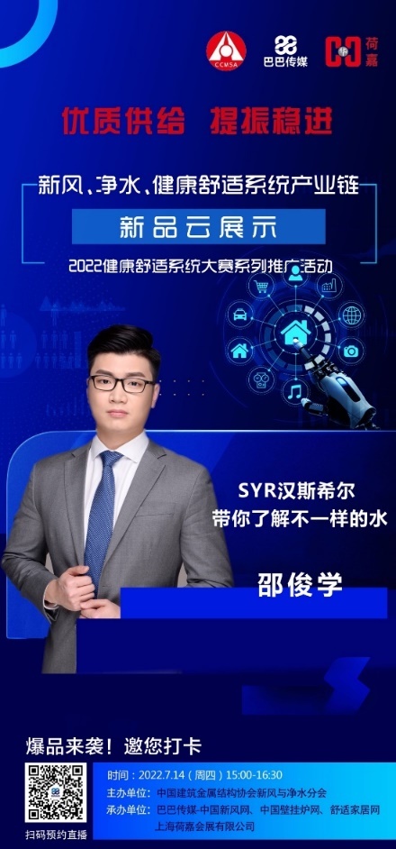 7月14日下午,由中國建筑金屬結(jié)構(gòu)協(xié)會新風(fēng)與凈水分會主辦的凈水、新風(fēng)、健康舒適系統(tǒng)產(chǎn)業(yè)鏈新品云展示活動在線以直播的形式舉行。SYR漢斯希爾作為凈水行業(yè)德系高端品牌參加了這場別開生面的線上展示會。